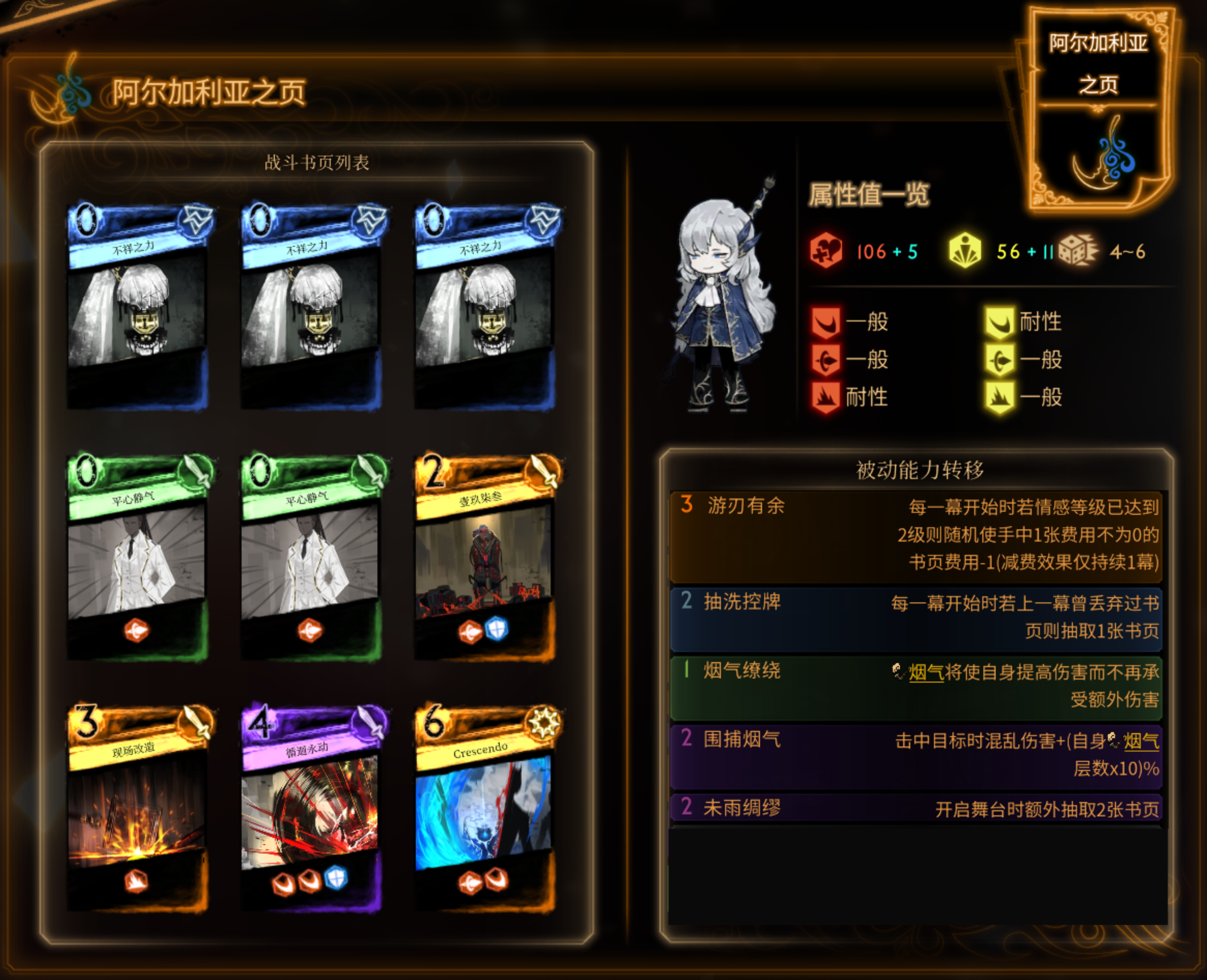 前两幕:根据场况决定,但需要尽量保证手牌数和情感(通过单骰劈子弹或空打 沉着冷静 可以高效拿情感)。若实在无法提升情感,尽量在 Cresendo 在手中时打出 现场改造。