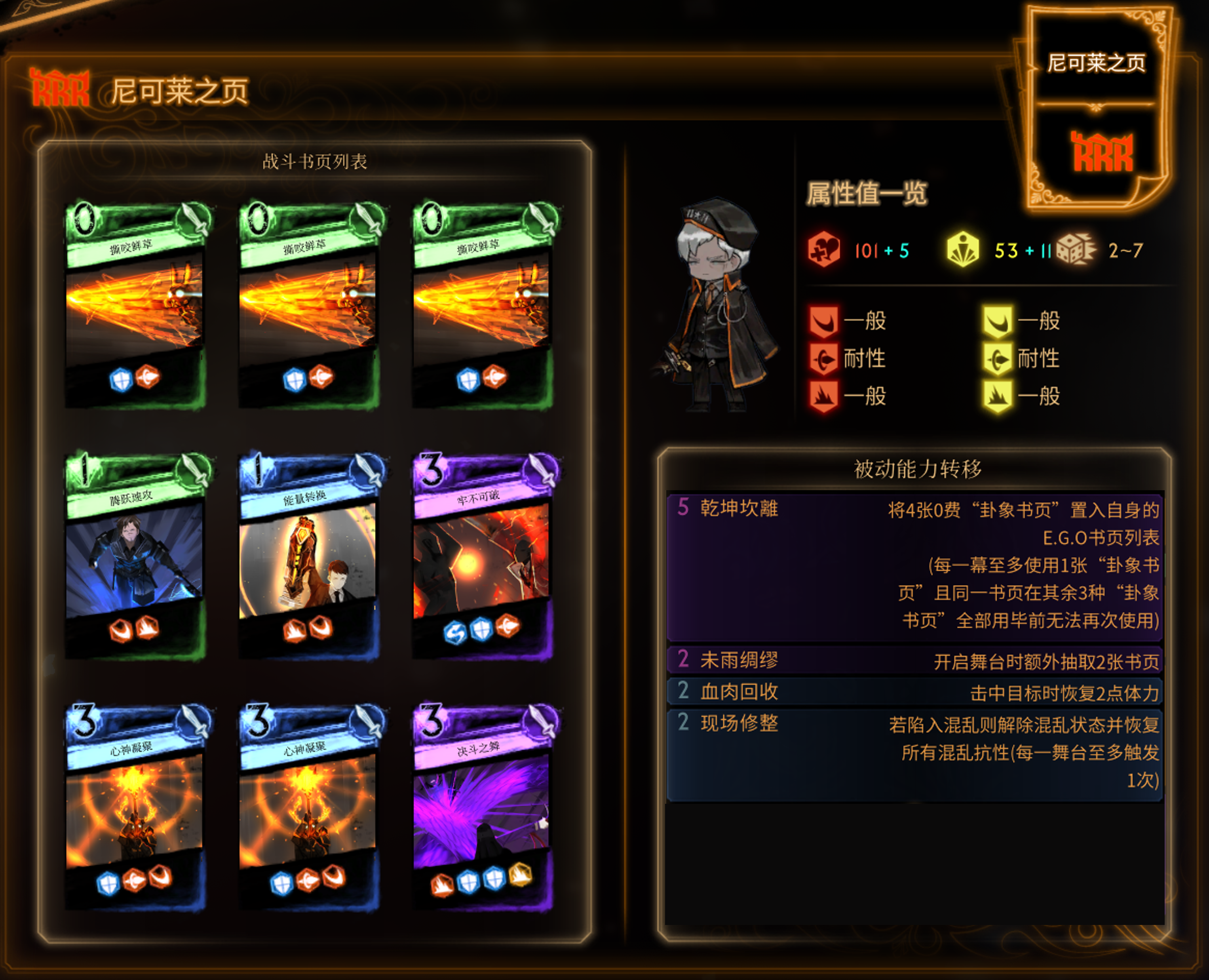 A:决斗之舞 是可以覆盖最多场景的止损卡;牢不可破 可以处理一种别的卡很难处理的结构(例:炎龙贯拳、平行普邀 3 中的 嗣道泽鸣),且还能抽卡,它们都是优秀的止损卡。如果你的尼可莱没有承伤止损的需求,可以换成进攻性或辅助性更强的卡,如 沙场指挥 或 严阵以待;同时可以把 现场修整 换成其他被动。