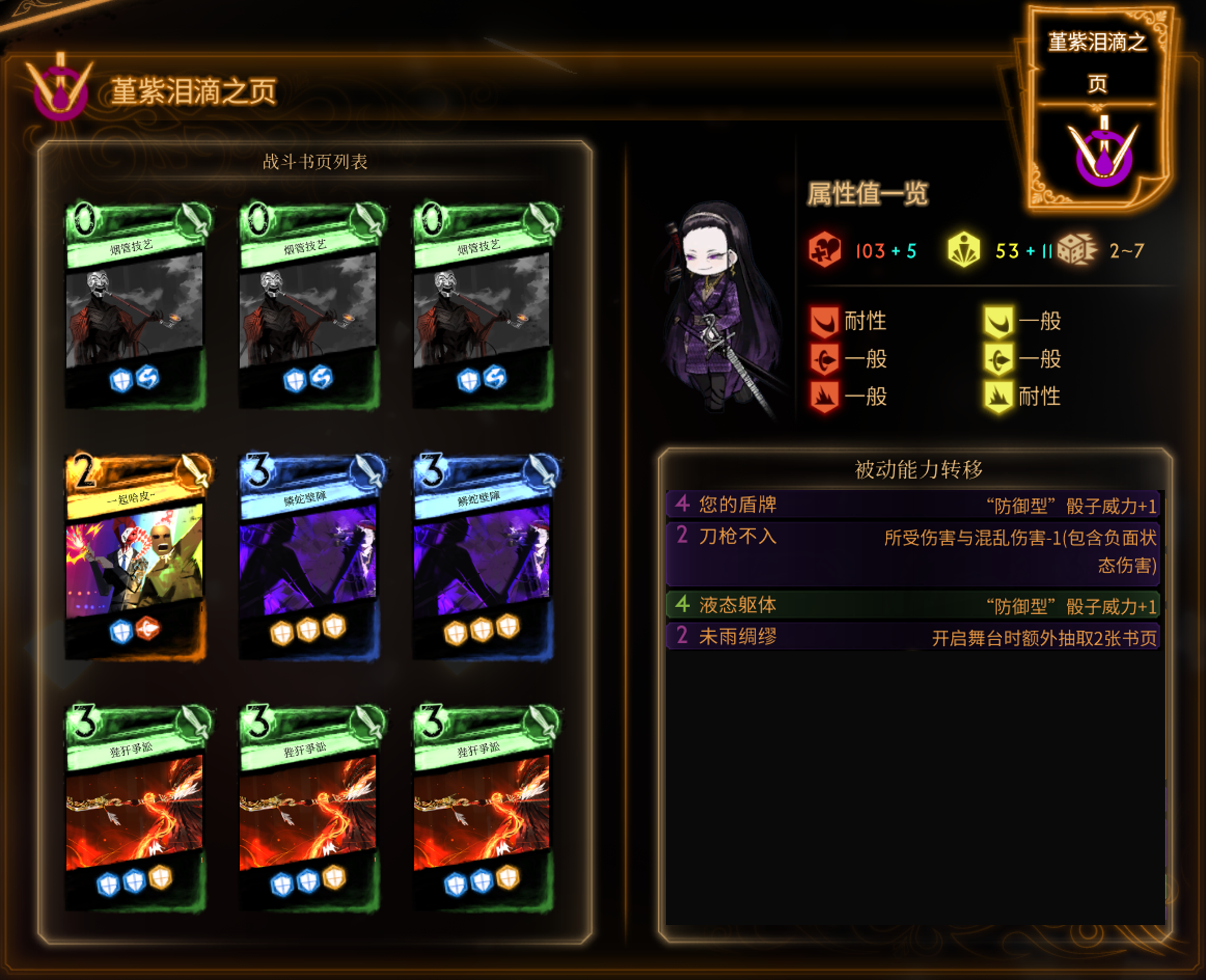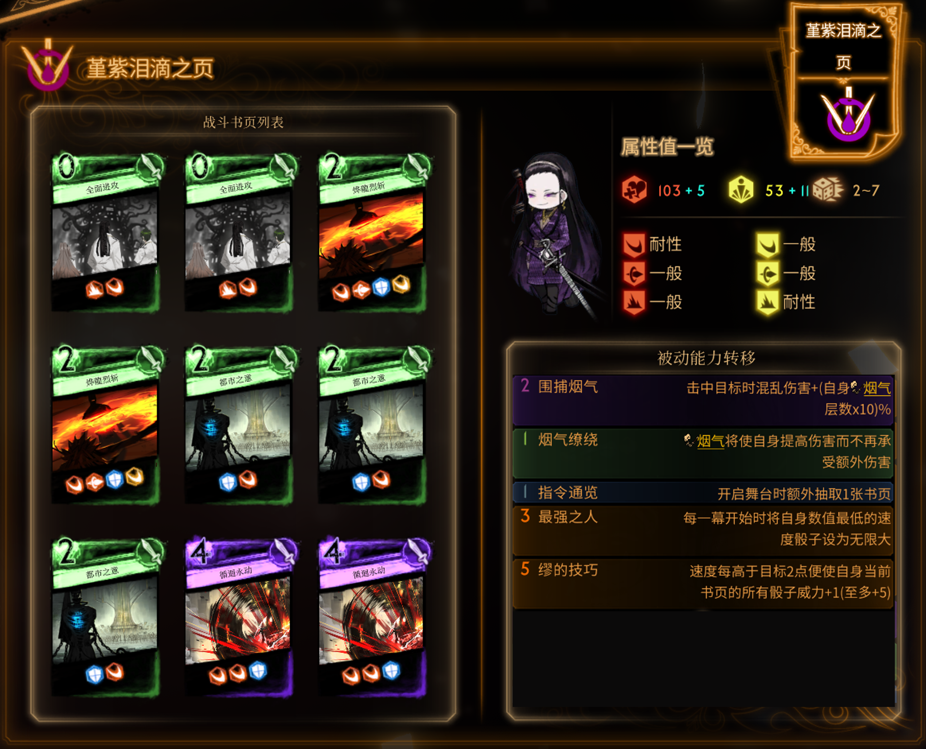 烟斩,适合需要快速出伤的场合,缺点是没有闪避、情感不足,只能做到永续 -9。