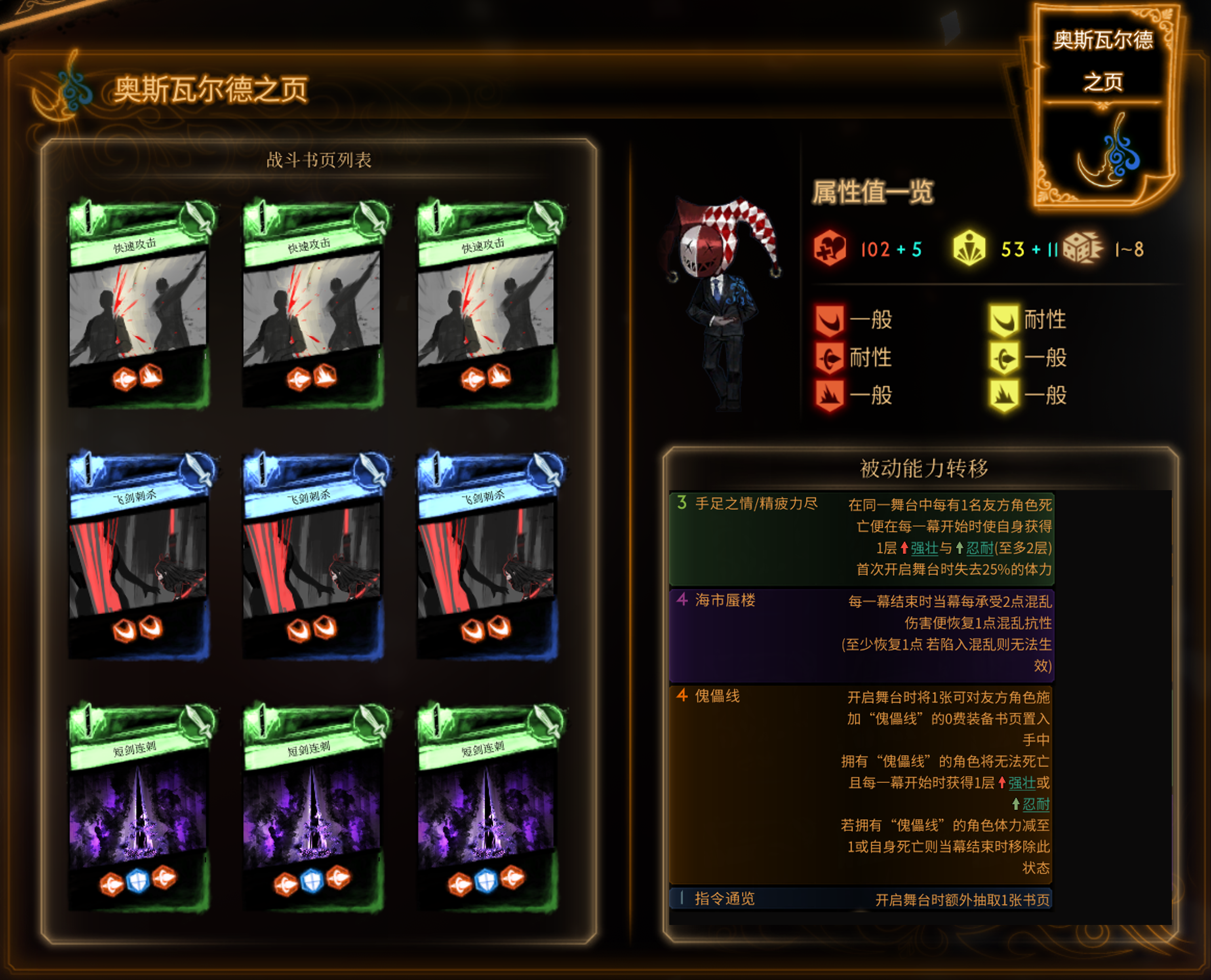 - 五情感循环为:2 贯通创伤 + 2 长驱直入,每回合亏 1 光,需要在适当时候用 一起哈皮 补回。